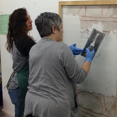 The fresco painter Michael Nichols is the BEST painting professor I ever had. At first it felt weird picking up a brush instead of a printmaker's brayer, but Michael was so encouraging and he truly wanted to share all his knowledge with the whole class. Despite the fact this process was completely foreign to me, I felt as if I had grown up in that studio, alongside the curing lime putty, the buckets of river sand, and portable ceramic tiles.